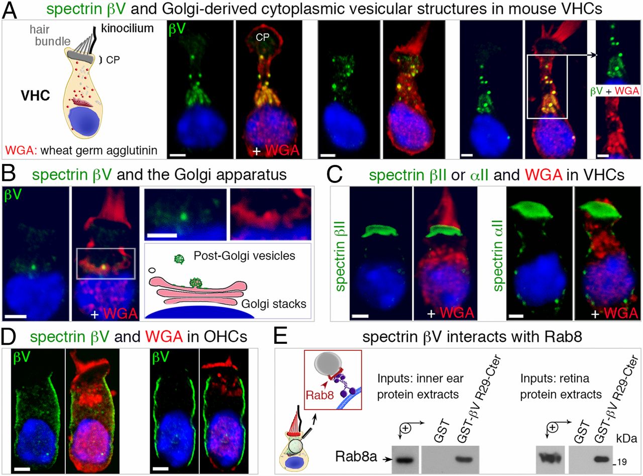 Spectrin βV associates with post-Golgi structures and binds to the Rab8 GTPase. (A) In mouse isolated vestibular hair cells (VHCs) on P10, the staining with TRITC-tagged wheat germ agglutinin (WGA) substantially overlaps with the spectrin βV immunostaining, both in the Golgi apparatus and in scattered post-Golgi secretory vesicles. (B) Focus on a spectrin βV-immunoreactive and TRITC-WGA-stained spot in the Golgi apparatus. (C) The TRITC-WGAâstained structures (red) are not colocated with spectrin αII- and spectrin βII-immunoreactive structures (green). (D) Unlike in VHCs, spectrin βV in mouse cochlear outer hair cells (OHCs) does not colocalize with TRITC-WGAâstained structures. (E) Spectrin βV binds to Rab8, a small GTPase involved in vesicular trafficking toward the plasma membrane. A GST-tagged R29-Cter fragment of spectrin βV (GST-βV R29-Cter), but not GST alone, binds to Rab8 present in protein extracts from the mouse inner ear or retina. Bars, 2 µm.