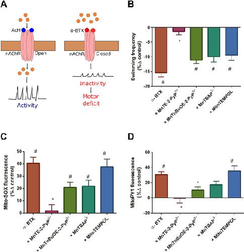 Fig. 1. α-BTX induced motor deficits are redox regulated. (A) α-BTX mechanism of action scheme. Left: skeletal muscle activity stems from acetylcholine (ACh) binding to post-synaptic nicotinic acetylcholine receptor (nAChR) to permit Na+ entry. Right: α-BTX ligates the nAChR to render it impermeable to Na+ leading to forced post-synaptic inactivity induced motor deficits. (B) Evoked swimming frequency (expressed as %δ control) by condition (α-BTX, α-BTX plus: MnTE-2-PyP5+, MnTnBuOE-2-PyP5+, MnTBAP3- or MitoTempol; n = 10 in each condition). (C) Mito-SOX oxidation (expressed as %δ control) by condition (n = 10 per condition). (D) MitoPY1 oxidation (expressed as %δ control) by condition (n = 10 per condition). Error bars are SEM. Concentrations and incubations: α-BTX (8 µM for 30 min), MnTE-2-PyP5+, MnTnBuOE-2-PyP5+, MnTBAP3- conditions = 1 µM for 30 min. MitoTempol = 20 µM for 30 min. # denotes significant difference vs control. * denotes significant difference vs α-BTX.
