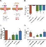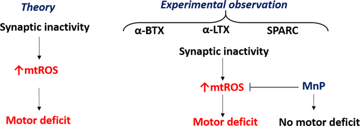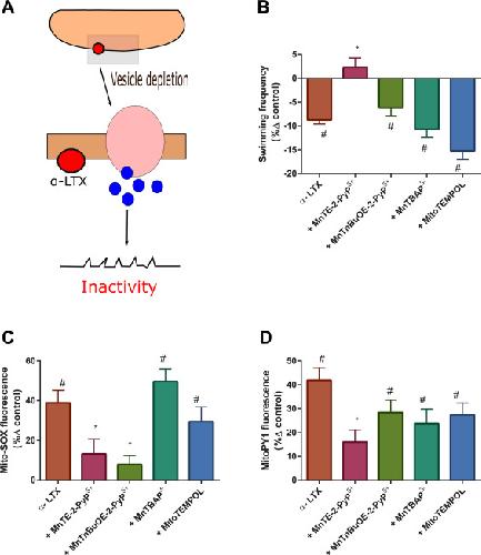 Fig. 2. α-LTX induced motor deficits are redox regulated. (A) α-LTX mechanism of action scheme. α-LTX binds to nerve terminals to cause mass neurotransmitter vesicle depletion, leading to pre-synaptic inactivity. (B) Evoked swimming frequency (expressed as %δ control) by condition (α-LTX, α-LTX plus: MnTE-2-PyP5+, MnTnBuOE-2-PyP5+, MnTBAP3- or MitoTempol; n = 10 in each condition). (C) Mito-SOX oxidation (expressed as %δ control) by condition (n = 10 per condition). (D) MitoPY1 oxidation (expressed as %δ control) by condition (n = 10 per condition). Error bars are SEM. Concentrations and incubations: α-LTX (15 nM for 30 min), MnTE-2-PyP5+, MnTnBuOE-2-PyP5+, MnTBAP3- conditions = 1 µM for 30 min. MitoTempol = 20 µM for 30 min. # denotes significant difference vs control. * denotes significant difference vs α-LTX.
