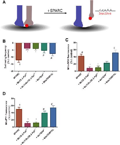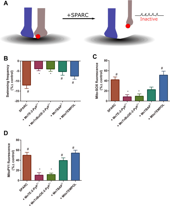 Fig. 3. SPARC induced motor deficits are redox regulated. (A) SPARC mechanism of action scheme. SPARC binds to weak synaptic inputs to selectively induce pruning—via a yet to be fully elucidated mechanism. Withdrawing inputs (retraction bulbs) are inactive; hence, global SPARC treatment can silence multiple NMJs to induce motor deficits. (B) Evoked swimming frequency (expressed as %δ control) by condition (SPARC, SPARC plus: MnTE-2-PyP5+, MnTnBuOE-2-PyP5+, MnTBAP3- or MitoTempol; n = 10 in each condition). (C) Mito-SOX oxidation (expressed as %δ control) by condition (n = 10 per condition). (D) MitoPY1 oxidation (expressed as %δ control) by condition (n = 10 per condition). Error bars are SEM. Concentrations and incubations: SPARC (50 nM for 30 min), MnTE-2-PyP5+, MnTnBuOE-2-PyP5+, MnTBAP3- conditions = 1 µM for 30 min. MitoTempol = 20 µM for 30 min. # denotes significant difference vs control. * denotes significant difference vs SPARC.