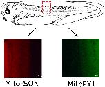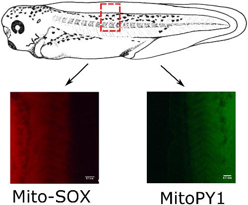 Supplementary Fig. 4. A stage 37â38 X. laevis tadpole with the location of a representative intermyotomal region sampled (red box) with florescent images of Mito-SOX and MitoPY1 oxidation shown below.