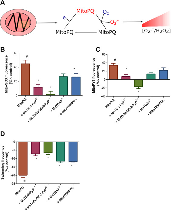 Fig. 4. MitoPQ induced motor deficits are redox regulated. (A) MitoPQ mechanism of action scheme. Within the mitochondrial matrix, MitoPQ accepts an electron from complex I to yield a MitoPQ radical. The MitoPQ radical reacts with molecular oxygen (O2) to generate O2.-, leading to an increase in matrix [O2.- and H2O2] (the latter as a consequence of MnSOD mediated O2.- dismutation). (B) Mito-SOX oxidation (expressed as %δ control) by condition (MitoPQ, MitoPQ plus: MnTE-2-PyP5+, MnTnBuOE-2-PyP5+, MnTBAP3- or MitoTempol n = 10 per condition). (C) MitoPY1 oxidation (expressed as %δ control) by condition (n = 10 per condition). (D) Evoked swimming frequency (expressed as %δ control) by condition (n = 10 in each condition). Error bars are SEM. Concentrations and incubations: MitoPQ (5 µM for 60 min), MnTE-2-PyP5+, MnTnBuOE-2-PyP5+, MnTBAP3- conditions = 1 µM for 30 min. MitoTempol = 20 µM for 30 min. #denotes significant difference vs control. *denotes significant difference vs MitoPQ.