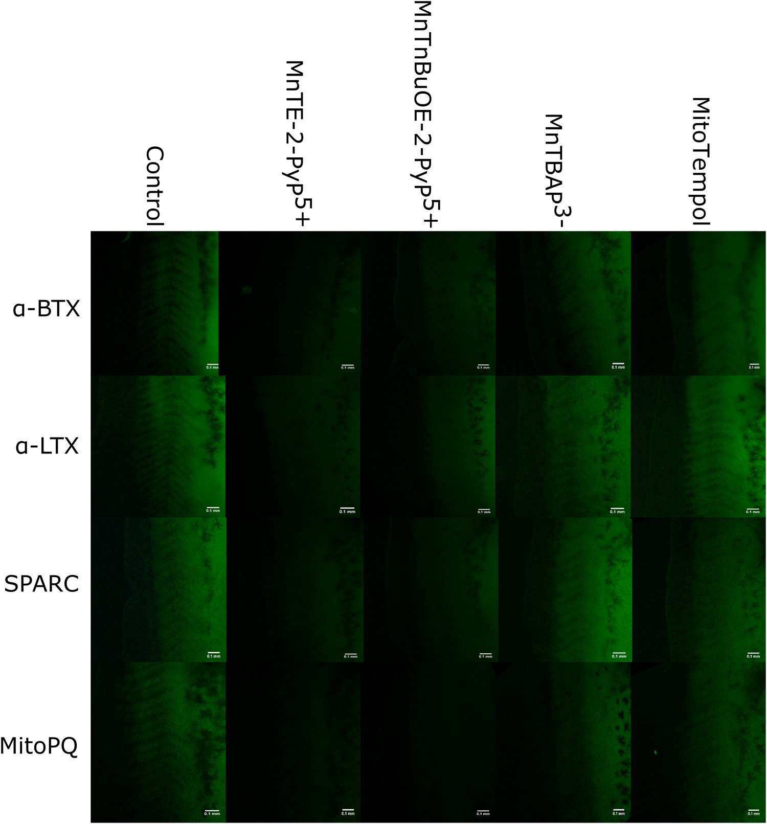 Supplementary Fig. 3. Representative florescent images of MitoPY1 oxidation in vivo by synaptic inactivity model (α-BTX, α-LTX, SPARC and MitoPQ) and treatment condition (control, MnTE-2-PyP5+, MnTnBuOE-2-PyP5+, MnTBAP3- and Mito-Tempol) taken from the intermyotomal region of stage 37–38 X. laevis tadpoles using whole-mount redox imaging. Scale bar is 0.1 mm.