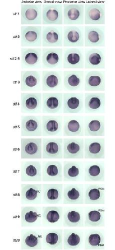 Fig 1.Whole-mount gfp in situ hybridization on Tg(pbin7Lef-dGFP) embryos from stage 11 to stage 20. For each stage, anterior, dorsal, posterior and lateral views are shown. White dotted lines on anterior views delineate the prospective central nervous system during neurulation. NC: migrating neural crest cells, PSM: posterior presomitic mesoderm. |
