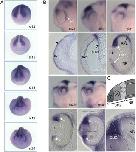 Fig 2. Wnt activity during gastrulation and neurulation in cross-sections. Embryo transverse (or cross-)sections following whole-mount gfp in situ hybridization on Tg(pbin7Lef-dGFP) embryos, from stage 12.5 to stage 20. For each stage, 7 serial sections are shown. White dotted lines delineate the somites. e: nonneural ectoderm; np: neural plate: brackets indicate the approximate width of the neural plate. |