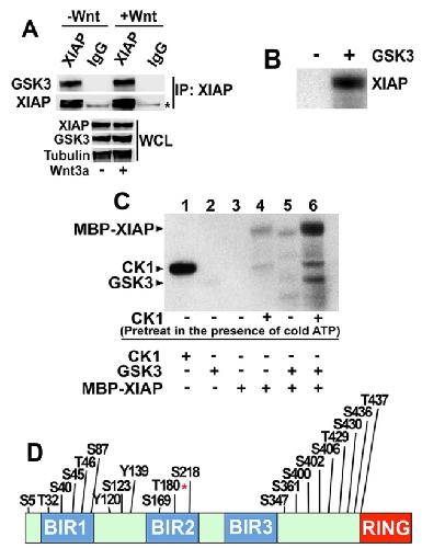XIAP is phosphorylated by GSK3 at T180. (A) Endogenous XIAP co-immunoprecipitates with endogenous GSK3. XIAP was immunoprecipitated (IP) from whole-cell lysates (WCL) of HEK293STF cells incubated in the absence or presence of recombinant Wnt3a followed by immunoblotting. The asterisk indicates the heavy chain of IgG. (B) Purified XIAP is phosphorylated by GSK3 in vitro in a [γ32P]ATP kinase assay. Reactions were analyzed by SDS/PAGE followed by autoradiography. (C) CK1 enhances XIAP phosphorylation by GSK3. XIAP bound to beads was incubated with CK1 in a kinase reaction containing non-radioactive (cold) ATP (lanes 4 and 6). CK1 was washed away and XIAP-bound beads incubated with GSK3 in a kinase reaction containing [γ32P]ATP. Reactions were analyzed by SDS/PAGE followed by autoradiography. Kinase only lanes show CK1 and GSK3 autophosphorylation (lanes 1 and 2). Results in AâC were replicated at least three times. (D) The predicted phosphorylation site at T180 of XIAP is an in vitro GSK3 phosphorylated site. Predicted phosphorylation sites on XIAP were curated by the PhosphoSitePlus online resource tool (Hornbeck et al., 2015). LC-MS analysis of XIAP identifies T180 (asterisk) as a prominent in vitro GSK3 phosphorylation site.