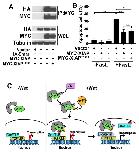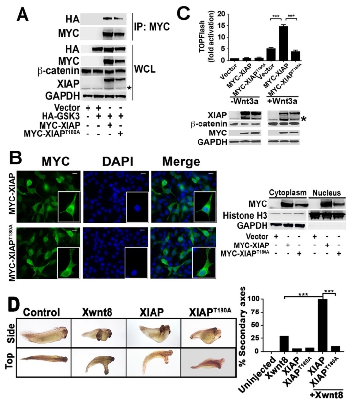 The XIAPT180A mutant exhibits decreased Wnt activity compared to wild-type XIAP in cultured human cells and in Xenopus embryos. (A) GSK3 associates with XIAP and the kinase mutant, XIAPT180A, to a similar extent. HEK293STF cells were transfected with vector, HAâGSK3, MYCâXIAP and MYC-XIAPT180A as indicated, whole cell lysates (WCL) were collected, and immunoprecipitation (IP) performed with anti-MYC antibody. The asterisk indicates endogenous XIAP. (B) The XIAPT180A mutant does not exhibit a localization that is distinct from XIAP. Left, HEK293STF cells were transfected with MYCâXIAP or MYCâXIAPT180A, fixed, and immunostained for MYC and DNA (DAPI). Scale bars: 12.5â µm. Right, cytoplasmic and nuclear fractionations were isolated from transfected cells and immunoblotted for MYC, Histone H3 (a nuclear marker) and GAPDH (a cytoplasmic marker). (C) In contrast to wild-type XIAP, XIAPT180A does not potentiate Wnt3a signaling. HEK293STF cells were transfected with vector, MYCâXIAP or MYCâXIAPT180A as indicated, for 24â h, and cells incubated in the absence or presence of recombinant Wnt3a for 24â h. The asterisk indicates endogenous XIAP. Graph shows mean±s.d. of TOPflash activation normalized to the cell titer. ***P<0.0001 (one-tailed Student's t-test). All experiments were repeated at least three times. (D) The XIAPT180A mutant does not potentiate Wnt8 (Xwnt8)-induced axis formation in Xenopus embryos, in contrast to wild-type XIAP. Embryos (four-cell stage) were injected ventrally with control, XIAPT180A or XIAP mRNA (2â ng each) with or without Wnt8 mRNA (0.1â ng) and allowed to develop. Representative Wnt8-, XIAP- and XIAPT180A-injected embryos are on the left. The percentage of embryos with secondary axis formation is shown on the right (nâ¥31 per group). ***P<0.0001 (Fisher's exact test, with Bonferroni correction). All results were replicated at least three times.