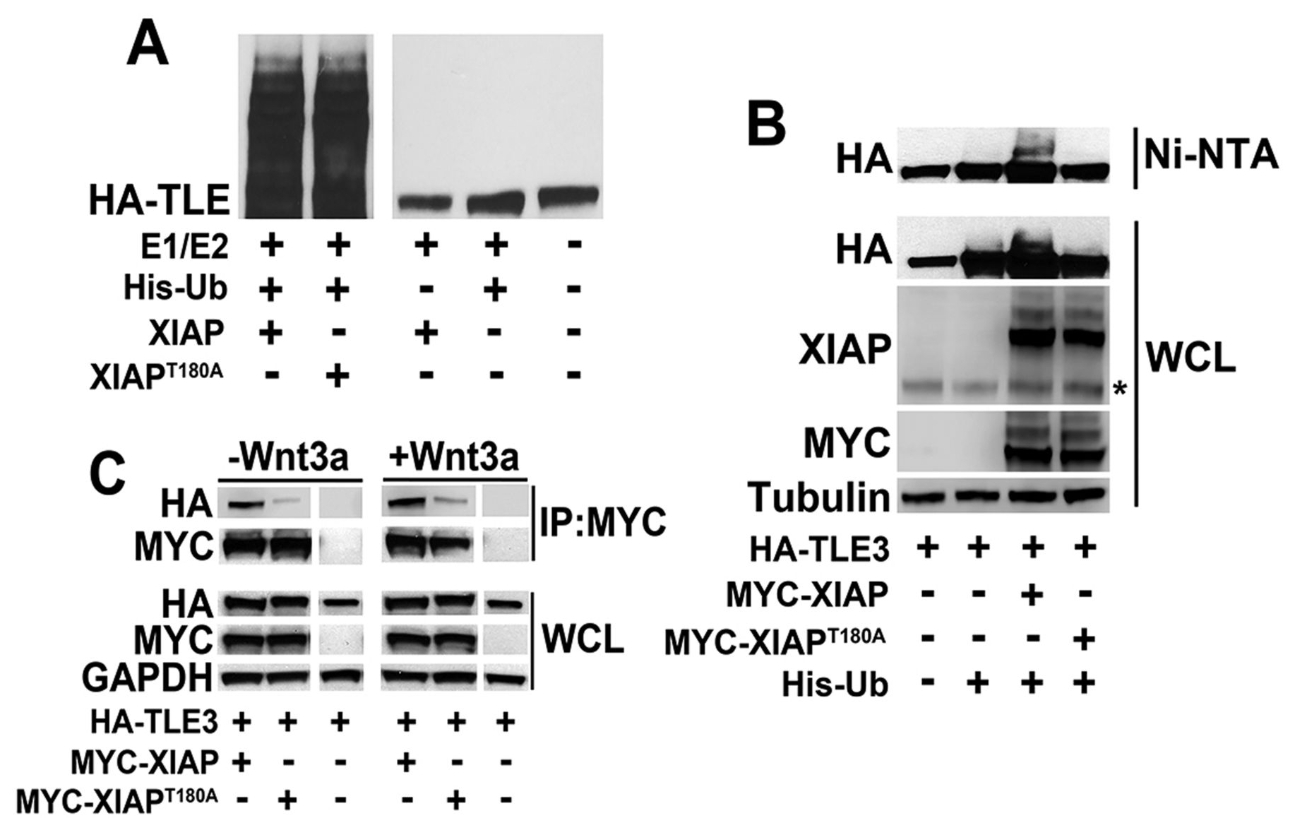 The XIAPT180A mutant shows decreased binding and ubiquitylation of TLE3. (A) XIAPT180A ubiquitylates TLE3 to a similar extent to wild-type XIAP in vitro. In vitro-translated HAâTLE3 was incubated in an in vitro ubiquitylation reaction containing recombinant E1/E2, ubiquitin, and XIAP or XIAPT180A. Ubiquitylated TLE3 was visualized by immunoblotting with anti-HA antibody. (B) XIAPT180A exhibits reduced capacity to ubiquitylate TLE3 in cultured human cells compared to wild-type XIAP. HEK293STF cells were transfected as indicated, lysed under denaturing conditions, and His-Ub-modified proteins isolated by nickel affinity chromatography. XIAP and TLE3 were detected by immunoblotting with anti-MYC and anti-HA antibodies, respectively. The asterisk indicates endogenous XIAP. WCL, whole-cell lysates. (C) XIAPT180A exhibits decreased affinity for HAâTLE3 compared to wild-type XIAP. HEK293STF cells were transfected for 24â h as indicated followed by incubation in the absence or presence of recombinant Wnt3a for 24â h. Lysates were collected and immunoprecipitated (IP) with anti-MYC antibody. Co-immunoprecipitated HAâTLE3 was detected by anti-HA antibody. All results were replicated at least three times.