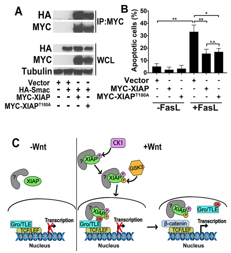 In contrast to its activity in the Wnt pathway, XIAPT180A has a similar activity to that of wild-type XIAP in the apoptotic pathway. (A) Smac co-immunoprecipitates (IP) with XIAP and XIAPT180A to a similar extent. HEK293STF cells were transfected as indicated with vector or HAâSmac plus MYCâXIAP or MYCâXIAPT180A. Lysates were collected and immunoprecipitation performed with anti-MYC antibody followed by immunoblotting with anti-HA antibody. WCL, whole cell lysates. Results were replicated at least three times. (B) Overexpression of XIAP and XIAPT180A decreases the percentage of Fas ligand (FasL)-induced apoptosis to a similar extent. HeLa cells were transfected for 24â h as indicated and incubated in the absence or presence of recombinant Fas ligand (100â ng/ml) for 24â h. Cells were then stained with Annexin V and propidium iodide. Graph shows the mean±s.d. of percentage of apoptotic cells. Data was analyzed and processed using FlowJo. **P<0.001, *P<0.01; n.s., not significant (one-tailed Student's t-test). All experiments were repeated at least three times. (C) A model for the regulation of XIAP activity in the Wnt pathway by phosphorylation at position T180. See text for more information.