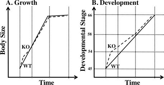 Diagrammatic representation of overall growth and development throughout the larval period and metamorphosis in wild-type and TRαKO tadpoles. A) TRαKO tadpoles (KO, dashed lines) initially grow faster than wild-type tadpoles (WT, solid lines) during premetamorphosis, but during the remainder of the larval period from the initiation of metamorphosis through to tail resorption, significant but small size differences are observed. B) TRαKO animals initially develop faster during premetamorphosis (<stage 54) ( Nieuwkoop and Faber, 1994 ) than wild-type tadpoles based on hind limb criteria. Then, during prometamorphosis (stages 54–58) when TH levels begin to increase, TRαKO animals progress more slowly than wild-type tadpoles based on hind limb criteria. Then, during climax of metamorphosis (stages 58–66), when TH levels reach their peak, TRαKO and wild-type tadpoles develop at a similar rate. The vertical dotted lines from left to right in both graphs indicate initiation of feeding (stage 45), initiation of metamorphosis (stage 54), mid-point of plasma TH levels during metamorphosis (stage 58), and tail resorption (stage 66).