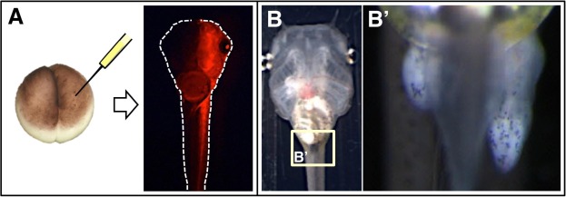 Mutations in TRα result in precocious initiation of hind limb morphogenesis. A) Injection of TALEN mRNAs targeting the DNA-binding domain of TRα was performed in one cell of a two-cell stage embryo of Xenopus tropicalis . mCherry mRNA was co-injected as a red fluorescent tracer to identify which side of the embryo (left in this case) was injected with TRα TALENs. B) Hind limbs of the resulting tadpole during premetamorphosis were examined for developmental progress on the injected and uninjected sides of the animal. As shown in Bâ², the hind limbs on the injected side are more advanced in size and stage, due to lack of TRα-mediated repression of genes important for metamorphic progression.