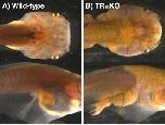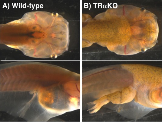 Hind limb and skin morphogenesis in the absence of TH signaling in TRαKO tadpoles. Wild-type (A) and TRαKO (B) tadpoles shown in dorsal and side views were reared in 1â¯Î¼M methimazole (inhibits TH synthesis) for 10â¯weeks starting at the initiation of feeding when the thyroid gland is forming. Development in the methimazole-treated wild-type tadpole is blocked at the beginning of metamorphosis, at the point when plasma TH levels begin to rise in untreated tadpoles. Notably, hind limb morphogenesis has stalled just after the paddle stage, and the skin is still thin and transparent as it is before it remodels to adult skin. In the methimazole-treated TRαKO tadpole, hind limb morphogenesis is complete, and in locations where adult skin replaces larval skin (i.e., not skin covering gills and tail), the skin has become opaque obscuring view of internal structures.