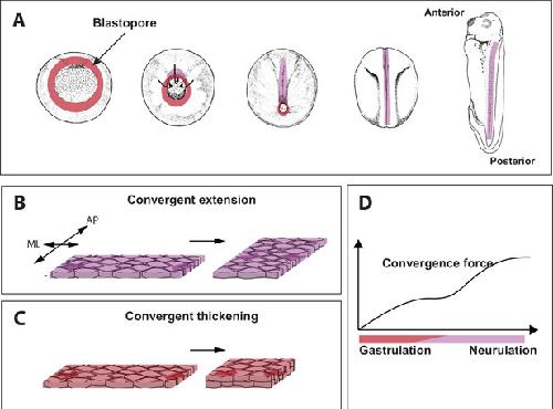 (A) During gastrulation a hollow sphere of cells (left) is transformed into an elongated embryo (right). This starts with cells on the dorsal (upper) side of the embryo rolling over a structure called the blastopore (red circle) and moving to the inside of the sphere. This reduces the size of the blastopore. Cell-autonomous convergence forces (purple) then cause the sphere to elongate, leading to the formation of the anterior–posterior axis. (B) The process by which tissue elongates along the anterior-posterior (AP) axis, and becomes narrower along the medio-lateral (ML) axis, is called convergent extension. (C) Shook et al. discovered that a process called convergent thickening – which involves the tissue becoming thicker in the direction at right angles to the convergent extension – is also important during gastrulation. (D). Sketch showing how the convergence force (y-axis) increases through gastrulation, and then plateaus (during early neurulation) before increasing again (during late neurulation).