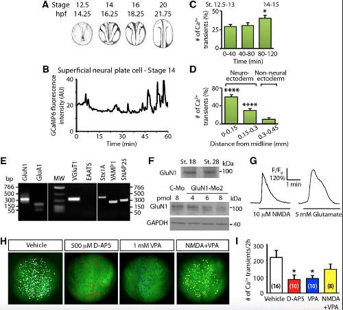 Fig 1 Ca2+ dynamics and glutamate signaling are present during neural tube formation. A, Developmental stages of X. laevis neural tube formation. hpf: hours post fertilization, hpf at 23°C. Adapted from the study by Nieuwkoop and Faber (1994). B, Representative trace of in vivo spontaneous changes in the Ca2+ sensor GCaMP6s fluorescence in a neural plate cell from a neurulating stage 14 embryo. C, Frequency of Ca2+ transients (per 40 min period, percentage of total number of transients in 2 h period, stages 12.5â14); values are the mean ± SEM, n = 12 embryos, *p < 0.05, ANOVA followed by Dunnett's test, compared with first 40 min period. St., Stage. D, Distribution of Ca2+ transients (per 2 h period) in the dorsal ectoderm (percentage of the total number of transients per 2 h period, stages 12.5â14); values are the mean ± SEM, n = 15 embryos. ****p < 0.0001, ANOVA followed by Dunnett's test compared with the most lateral region. E, RT-PCR from the dorsal half of stage 13 embryos. F, Western blot assay from whole-embryo lysates at neural plate (stage 18) and tailbud (stage 28) stages (top), and from neural plate stage (stage 18) embryos injected at the two-cell stage with C-Mo or GluN1-Mo2 (bottom). Similar results were obtained in three independent experiments. G, Traces from stage 15-dissociated neural plate cells loaded with the Ca2+-sensitive dye Fluo4-AM and imaged during the addition of 10 μm NMDA or 5 mm glutamate. Lines under the traces indicate the time of incubation with NMDA or glutamate. Samples were time-lapse imaged at a rate of 0.2 Hz for 5 min. Regions of interest were selected to measure the fluorescence intensity over time for individual neural plate cells with NIS Elements software (Nikon). Fluorescence (F) is normalized to the baseline for each cell (F0) as a percentage. H, Examples of GCaMP6s-expressing embryos imaged in the absence (vehicle) or presence of the indicated drugs for 2 h starting at stage 12.5. Circles indicate the occurrence of Ca2+ transients. Ten micromolar NMDA was preincubated for 30 min before the addition of 1 mm VPA (NMDA+VPA). I, Frequency of Ca2+ transients (per 2 h period, stages 12.5â14); values are the mean ± SEM, numbers between parentheses are the number of embryos per treatment. *p < 0.05, one-way ANOVA, followed by Dunnett's test compared with vehicle-treated samples. |