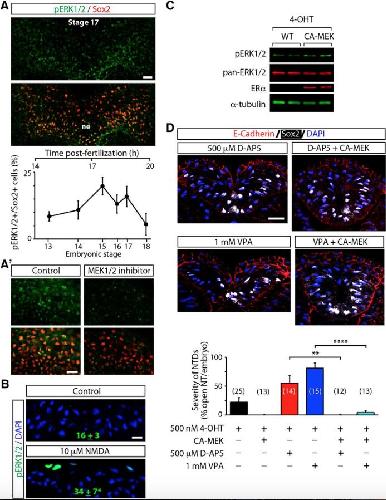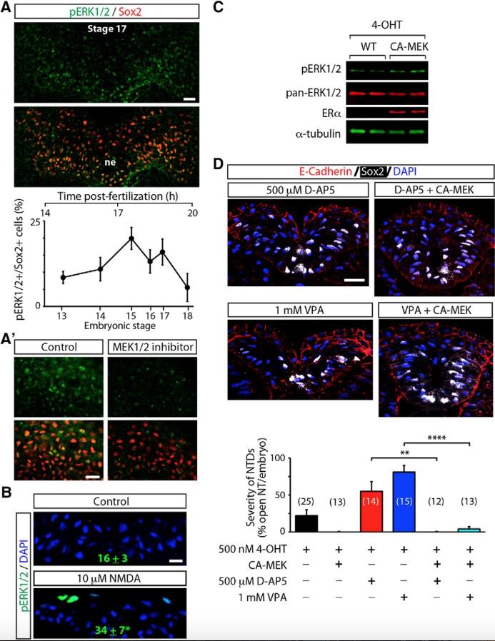 Fig 5 ERK1/2 activation is downstream of glutamate-NMDAR signaling in the promotion of neural tube closure. A, Whole-mount stage 13 through stage 18 embryos immunostained for pERK1/2 and Sox2 were imaged coronally and analyzed using Imaris 3D software. Images show a single plane of a representative z-stack of the dorsal half of a stage 17 embryo. ne, Neural ectoderm. The graph shows the percentage of pERK1/2-immunopositive neural plate cells identified by Sox2 expression; values are the mean ± SEM, n = 4â7 embryos per stage. The line connects data points at sequential developmental stages (bottom x-axis) corresponding to different times postfertilization (top x-axis). Aâ², To confirm specificity of the pERK1/2 antibody, embryos were incubated with either vehicle (control) or 10 μm PD0325901 (MEK1/2 inhibitor) from stage 11.5 to stage 15, then were processed for whole-mount immmunostaining. B, Stage 13 embryos were incubated with 10 μm NMDA or vehicle (control) for 5 min followed by processing for pERK1/2 immunostaining. Shown are immunostained transverse sections of neural plate and number of pERK1/2-immunopositive cells per 10 30 μm sections of neural plate per embryo; values are the mean ± SEM; n = 14 embryos per treatment. **p < 0.005, t test. C, Western blot assay from whole-embryo lysates of WT and CA-MEK1-ERα expressing (CA-MEK) stage 15 embryos treated with 500 nm 4-OHT from stage 11. Similar results were obtained in three independent experiments. D, Activation of ERK1/2 rescues d-AP5 or VPA-induced NTD. WT or CA-MEK-injected embryos were incubated with 4-OHT from stage 11 followed by incubation with vehicle or with 500 μm d-AP5 or 1 mm VPA from stage 13, then fixed and processed for transverse sectioning and immunostaining at stage 22, as shown in images. Graph shows the severity of NTDs, which is the percentage of transverse sections of the entire anteroposterior axis with open neural tube per embryo; values are the mean ± SEM; between parentheses are the number of embryos per group, from at least three independent experiments. ****p < 0.0001, one-way ANOVA followed by Tukey's test. Scale bars, 20 μm. |