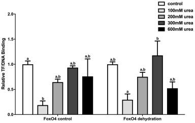 Fig. 4. The effect of adding free urea on the transcription factor-DNA binding affinity of FoxO4. Transcription factor-DNA binding was measured during the control and high dehydration sampling points with no urea added (control), 100â¯mM urea, 200â¯mM urea, 300â¯mM urea, and 600â¯mM urea added. Modified DPI-ELISA absorbance readings were corrected by subtraction of negative control containing no protein, and values were expressed relative to the control (no urea added) for the control and high dehydration sampling points. Histograms show mean relative valuesâ¯Â±â¯S.E.M., nâ¯=â¯4 independent biological replicates for both experimental conditions. Data was analyzed using a one-way analysis of variance with a post hoc Tukey's test (pâ¯<â¯0.05); for each parameter measured, values that are not statistically different from each other share the same letter notation.