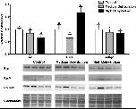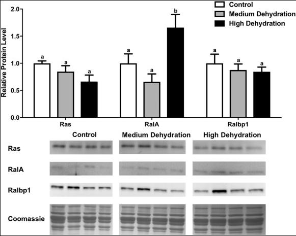 Fig. 1. Changes in Ras, RalA, and Ralbp1 total protein levels in the skeletal muscle of X. laevis during dehydration stress. Ras, RalA, and Ralbp1 total protein levels were visualized at three sampling points: control, medium dehydration, and high dehydration. Western blots and Coomassie total protein loading controls representative of the results are shown for the three sampling points. Also shown are histograms with mean standardized band densities (±S.E.M., nâ¯=â¯4 independent protein isolations from different animals). Data was analyzed using a one-way analysis of variance with a post hoc Tukey's test (pâ¯<â¯0.05); for each parameter measured, values that are not statistically different from each other share the same letter notation.