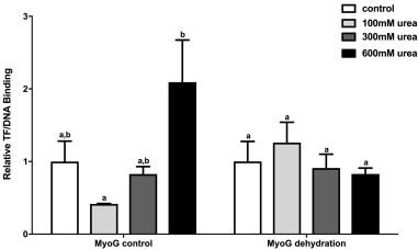 Fig. 5. The effect of adding free urea on the transcription factor-DNA binding affinity of MyoG. Transcription factor-DNA binding was measured during the control and high dehydration sampling points with no urea added (control), 100â¯mM urea, 300â¯mM urea, and 600â¯mM urea added. Modified DPI-ELISA absorbance readings were corrected by subtraction of negative control containing no protein, and values were expressed relative to the control (no urea added) for the control and high dehydration sampling points. Histograms show mean relative valuesâ¯Â±â¯S.E.M., nâ¯=â¯4 independent biological replicates for both experimental conditions. Data was analyzed using a one-way analysis of variance with a post hoc Tukey's test (pâ¯<â¯0.05); for each parameter measured, values that are not statistically different from each other share the same letter notation.