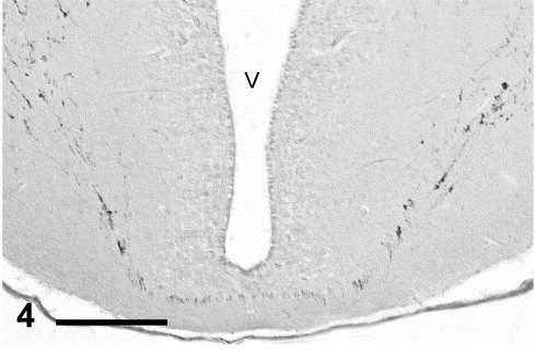 CERN-874-immunopositive fibers in a section of the brain which is more caudal than the MPON. Bundles of fibers running towards the basal areas are observed (V, third ventricle). Bar: 100 μm.