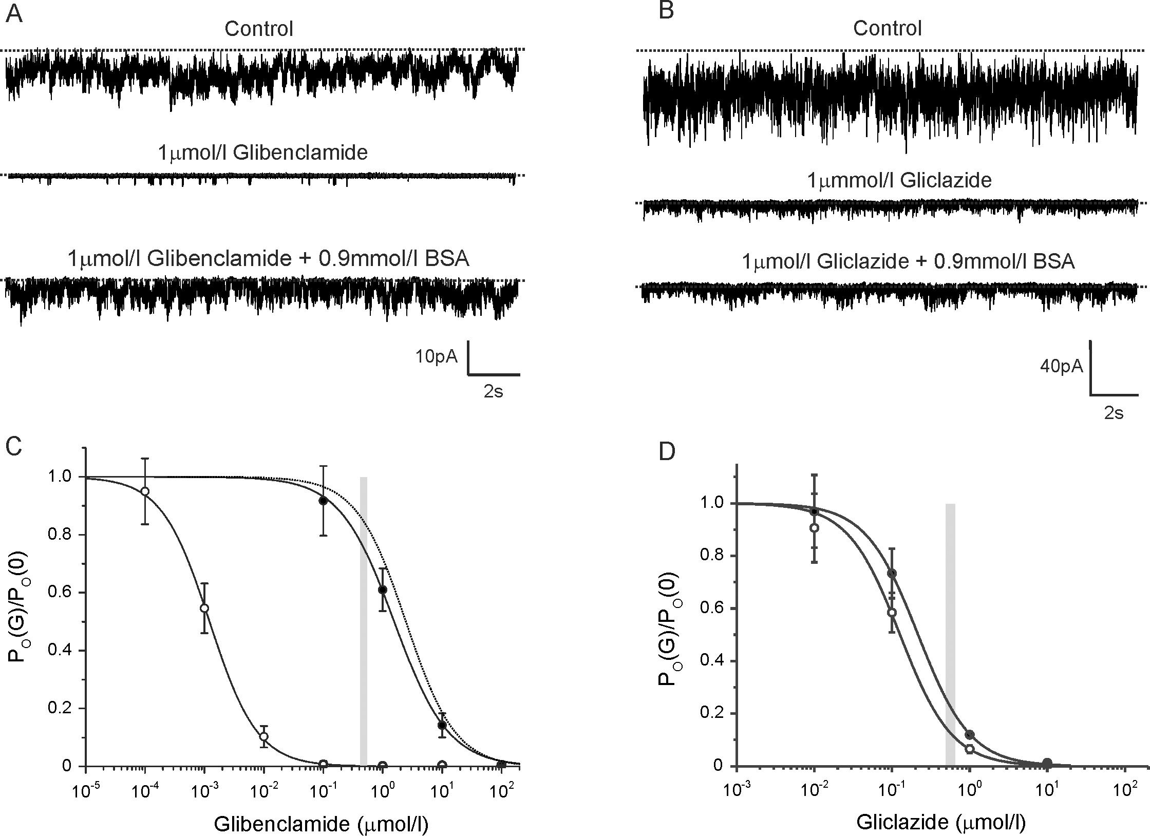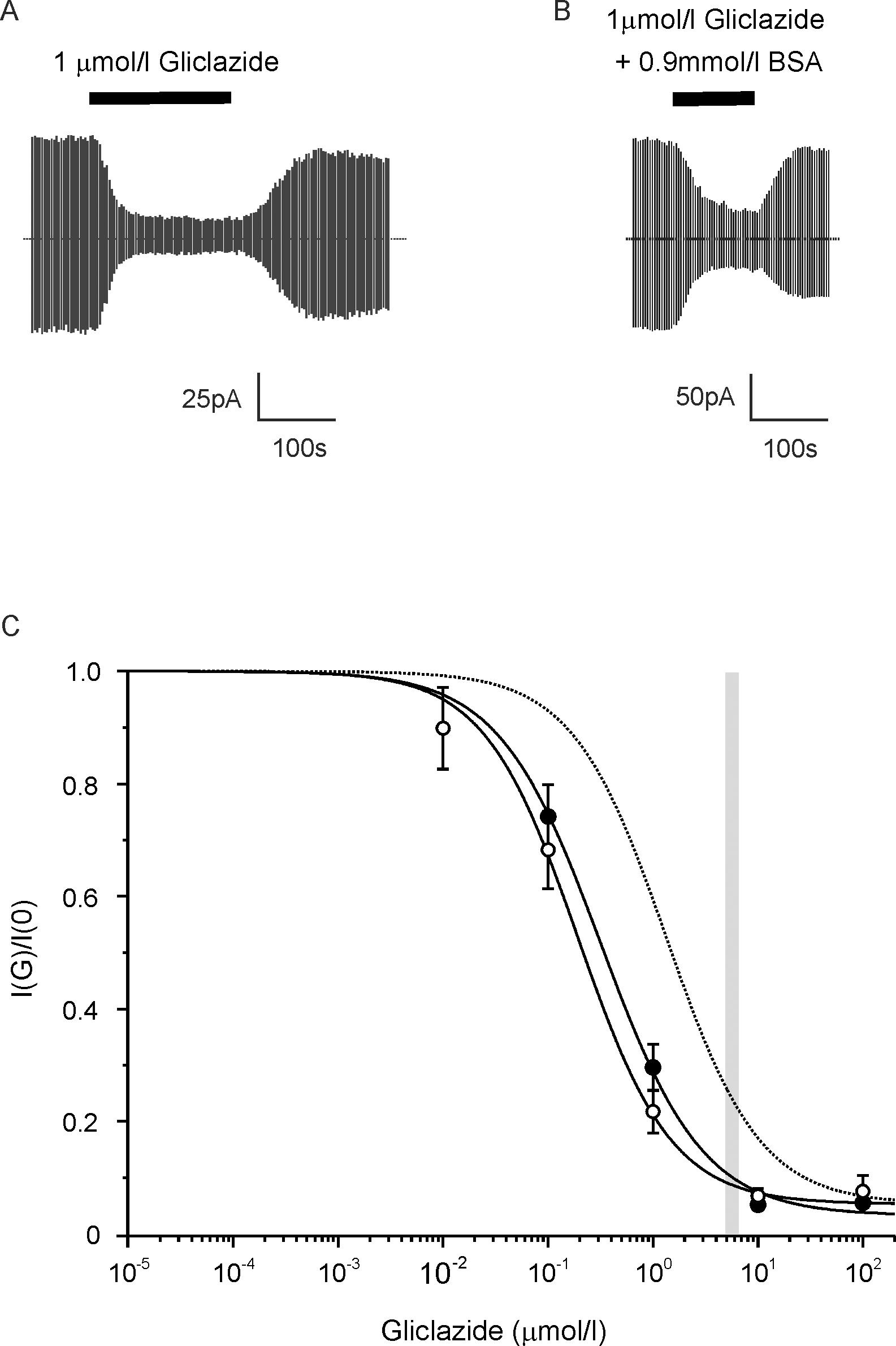 Concentration-response relationships for gliclazide inhibition of Kir6.2/SUR1 currents in the absence (, n = 10) and presence (●, n = 10) of 0.9mmol/l BSA. Open