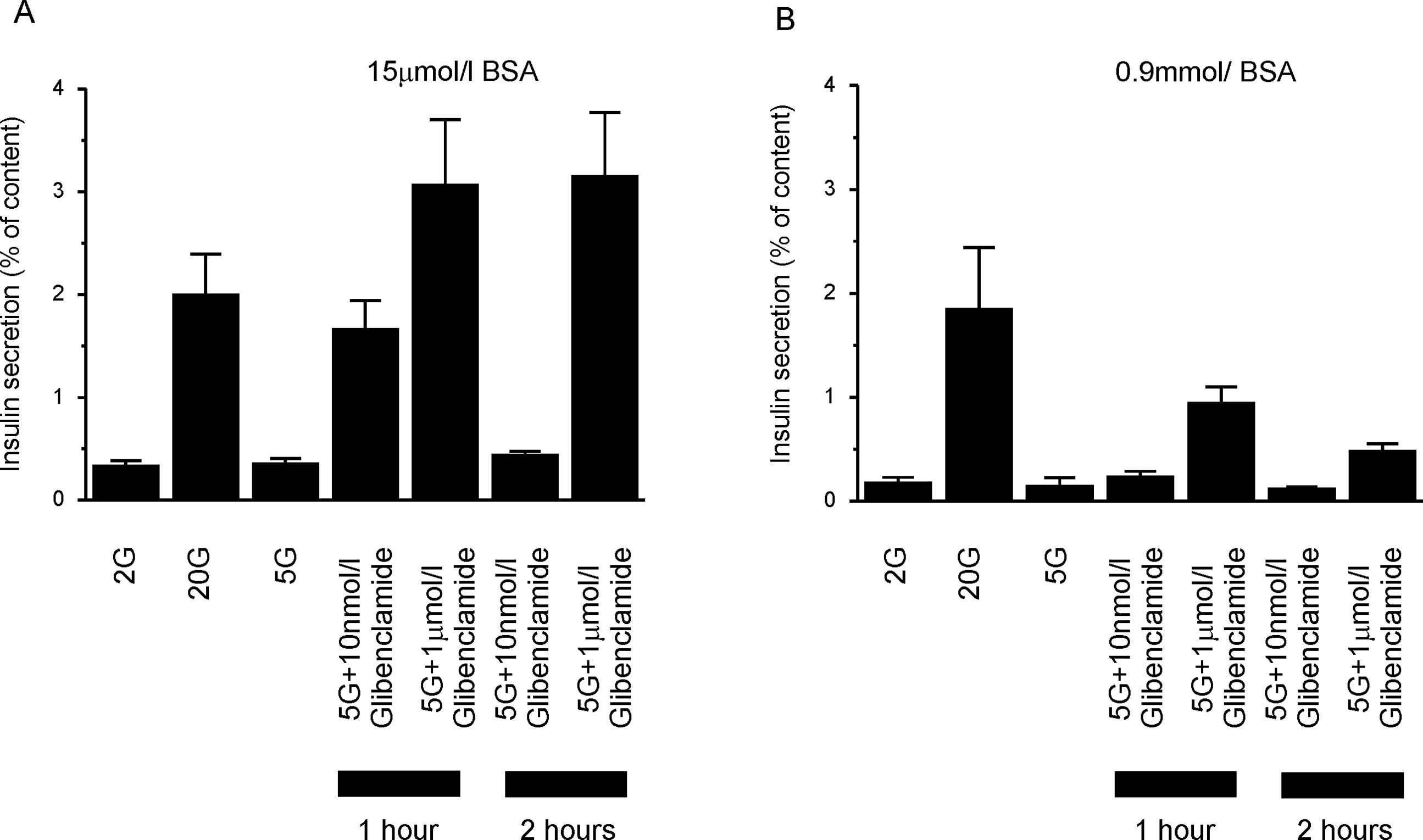 minute stimulation with various glucose and glibenclamide concentrations, as indicated, in the presence of (A) 15μmol/l BSA or (B) 0.9mmol/l BSA (n = 3 animals, 3