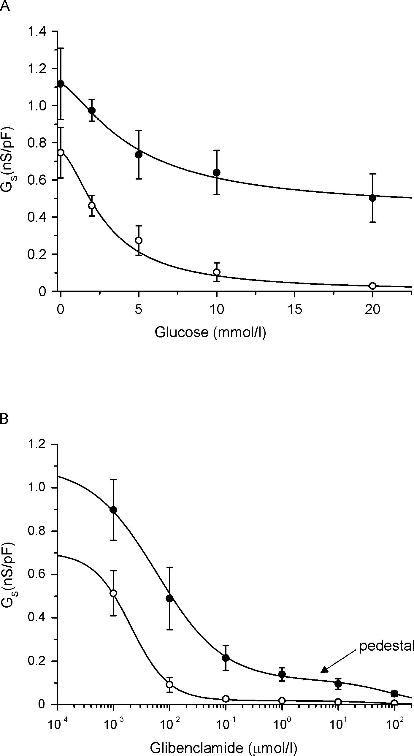 as those in [18] but are replotted as nS/pF. Note the ‘pedestal’ (arrowed) in the dose-response curve for glibenclamide
