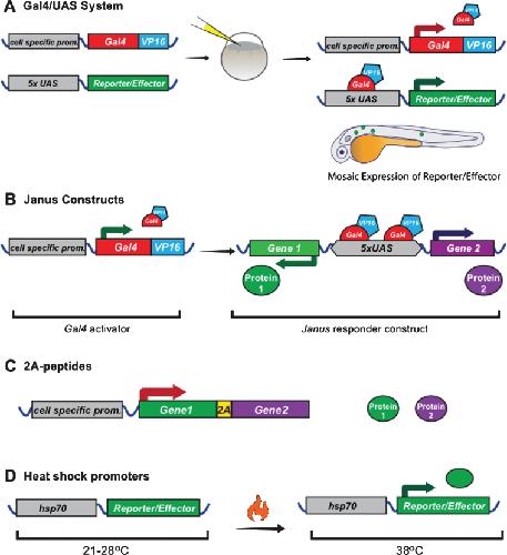 Fig.3. Example strategies to control gene expression in zebrafish and Xenopus. A) Plasmids that can drive expression of the transcriptional activator Gal4-VP16 can be co-injected into embryos together with plasmids that encode genes-of-interest downstream of Upstream Activator Sequences (UAS). Gal4 trans-activates UAS and can amplify gene expression. When injected in this way, it leads to mosaic gene expression. Stable transgenic lines expressing Gal4 in specific cell types or UAS effectors can be generated as in Fig. 1. B) The Gal4-UAS system can be modified to control expression of multiple genes from one plasmid. In the Janus system Gal4 trans-activates UAS, which drives gene expression in both directions, if minimal promoters are present upstream of the genes of interest. C) Alternative strategies exist to express two genes from one construct including the self-cleaving 2A peptide sequence, which can be placed between two open reading frames in one mRNA, which is then translated as two polypeptides due to ribosome skipping. D) Temporal control of gene expression can be mediated by the use of heat sensitive promoters, which are only active at specific temperatures. |