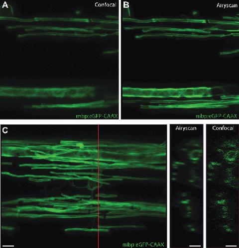 Fig.5. Confocal super-resolution imaging. A+B are images of the stable transgenic reporter mbp:eGFP-CAAX, which labels myelin sheaths, taken in confocal (A) and Airyscan (B) modes. A clear improvement in resolution in the X-Y plan is observed. C indicates improvement in z-axis resolution in Airyscan mode. The red line indicates the position where the Y-Z projections on the right were taken. Definitive circular rings of myelin membrane are observable in the Airyscan mode. Scale barsâ=â5 μm. |