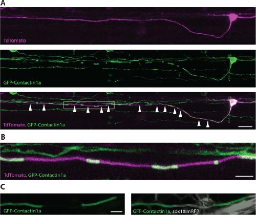 Fig.6. Transgenic tool to visualize myelin along individual axons in vivo. A fluorescent fusion of GFP with the GPI anchored axonal protein contactin1a can be expressed in individual neurons together with a fluorescent protein that labels the entire cell, e.g. Tandem dimer (Td) Tomato (A). Gaps in GFP-Cntn1a localisation along axons (A+B) correspond to the locations of myelin sheaths, as shown in (C) where all myelin is labelled using the sox10:mRFP reporter. Scale bars: Aâ=â20 μm, B+Câ=â5 μm. |