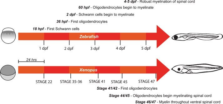 Fig.1. Timeline of developmental myelination in zebrafish larvae and Xenopus tadpoles. Schematic indicates rapid development of zebrafish and Xenopus embryos from one cell stage (left) to larvae (right) with myelinated axons. hpf = hours post fertilisation. dpf = days post fertilisation. |
