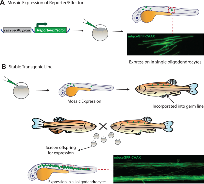 Fig.2. Generation of transgenic zebrafish to visualize myelinating oligodendrocytes. A) Transgenic animals with mosaic fluorescent reporter expression in myelinating oligodendrocytes can be generated by injection of plasmid at the one cell stage, and visualized in the injected animals at early larval stages. B) Transgenic animals with stable expression of a transgene that labels all myelin in the animal are first injected with plasmid as in A, then grown to adulthood. Adults are bred with non-transgenic animals to identify those in which plasmid integration has occurred in the germ-line and which can generate offspring with expression in all myelinating oligodendrocytes. |