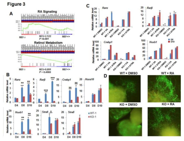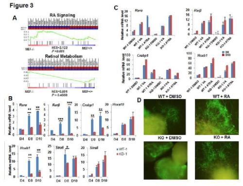 Figure 3. Endogenous RA signaling is inactivated during differentiation of Strap KO ESCs. A. Gene set enrichment