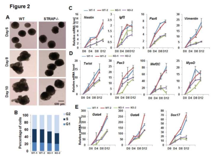 morphology during EB formation from Strap WT and KO ESCs at the indicated time points. Scale bar = 600 um. B. The
