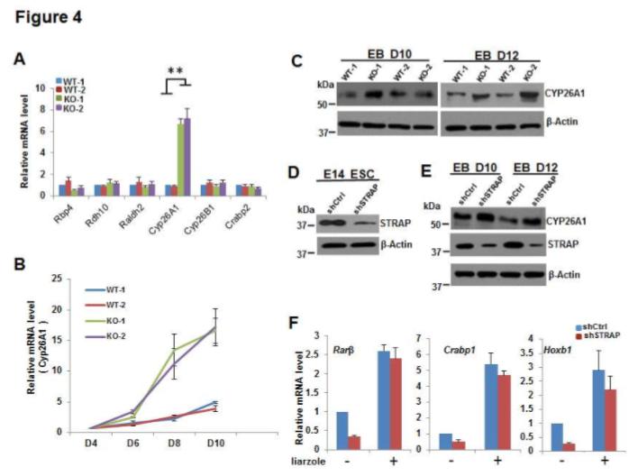 Figure 4. Loss of STRAP results in increased CYP26A1 mRNA and protein levels during EB differentiation. A. RT‐qPCR