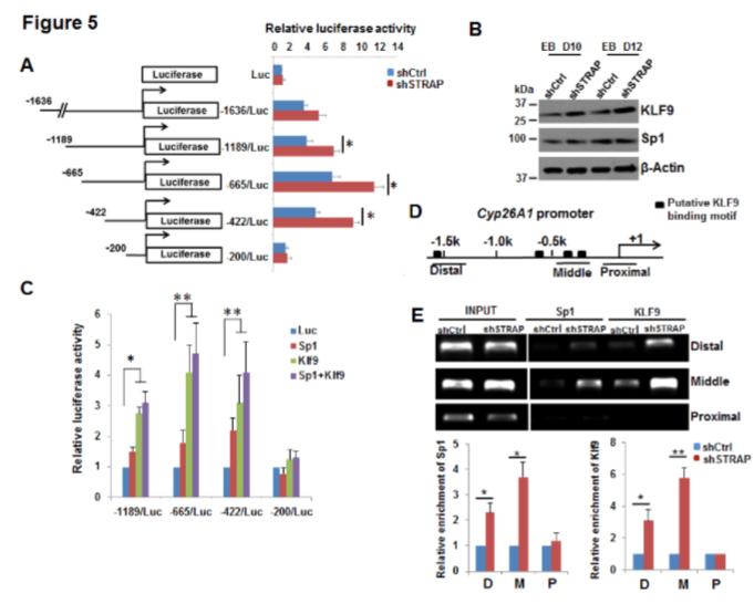 Figure 5. Krüppel‐like factor 9 (KLF9) and Sp1 coordinately regulate Cyp26A1 transcription in STRAP‐depleted EBs.