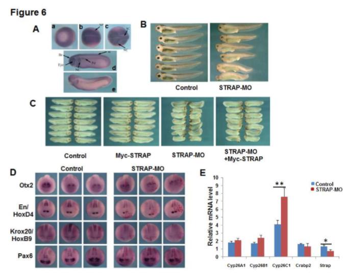 the expression of STRAP protein in the control and STRAP knockdown E14 polyclonal cells. E. Levels of CYP26A1 and