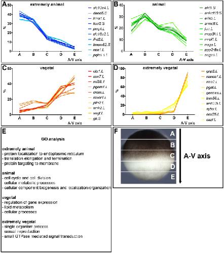 Figure 2. Intracellular profiles for selected extremely animal (A), animal (B), vegetal (C) and extremely vegetal (D) mRNAs. Predicted functions based on gene ontology (GO) analysis (E). Scheme of A-V sectioning (F).