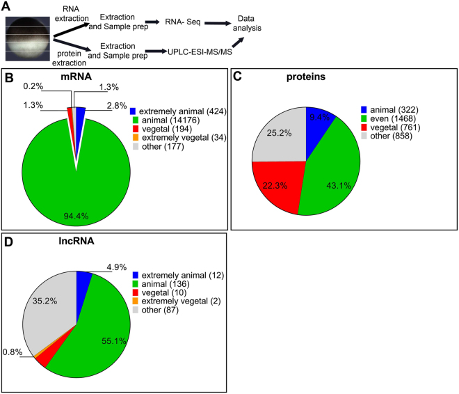 Figure 1. Classification of the studied biomolecules into localization categories based on their intracellular profiles. Experimental scheme (A). Classification of 15005 mRNAs (B), classification of 3409 proteins (C) and classification of 247 long noncoding RNAs (D).
