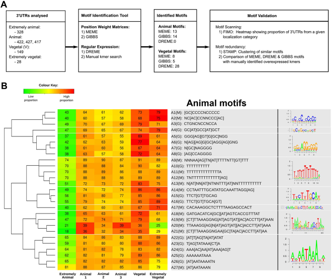 Figure 4. Scheme for the identification of localization motifs (A). Cluster analysis of the animal localization motifs identified using MEME (A1M-A27M) and GIBBS (A3G-A26G). Heatmap indicates the proportion of motifs and the numbers the percentage of the 3′UTRs that contains the motifs (B).