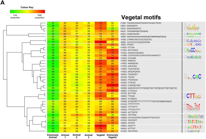 Figure 5. Cluster analysis and motif validation for the motifs behind vegetal localization identified using MEME (V1M-V36M), GIBBS (V3G-V33G) and DREME (V2D-V41D). Heatmap indicates proportion of motifs and numbers reflect percentage of 3′UTRs containing at least one copy of a motif (B).