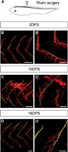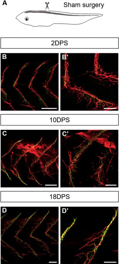 (A) Scheme of the sham operation procedure in NF50 X. laevis embryos, where only the skin and the superficial muscle tissues were injured. (B-D) Sham tadpoles were collected 2 (B), 10 (C) and 18 (D) days post sham (DPS). Embryos were immunostained to label neurons (using 3A10 plus SV2 antibodies, red) along with staining of AChR aggregates with BTX (green), and subsequently imaged by confocal microscopy. Magnified images of B, C and D are shown in B', C' and D', respectively. Orientation of embryos: anterior (left), posterior (right), dorsal (up), ventral (down). Scale bars: 200â¯Î¼m (B,C,D); 100â¯Î¼m (B',C',D').