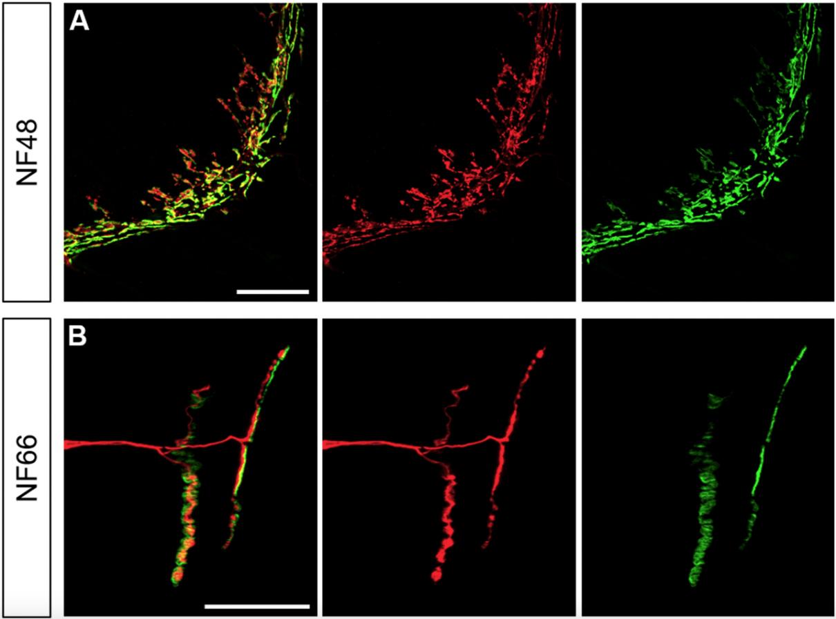 Whole mounted X. tropicalis NF48 embryos at the medial ventral region (A) and longitudinal sections of Tibialis anterior longus muscles obtained from NF66 post-metamorphic X. laevis froglets (B) were immunostained to reveal neurons (3A10 plus SV2 antibodies, red) and AChR aggregates (BTX staining, green), and subsequently imaged by confocal microscopy. Scale bars: 50â¯Î¼m (A); 30â¯Î¼m (B).