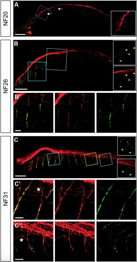 X. tropicalis embryos obtained at stages NF20 (A), 26 (B), and 31 (C) were stained by immunodetection of neurons (using 3A10 plus SV2 antibodies, red) along with staining of AChR aggregates with BTX (green), and subsequently imaged by confocal microscopy. Magnified images of the region labelled with a white dotted line square in A, B and C are shown in their respective insets (merge in A; upper: AChR, lower: neuronal staining in B and C). Magnified images of the rostral region labelled with a cyan square in B are shown in B' (left: merge, middle: neuronal, and right: AChR staining). Magnified images of the regions labelled with cyan and yellow squares in C are shown in C' and C'', respectively (left: merge, middle: neuronal, and right: AChR staining in C' and C"). Orientation of embryos: anterior (left), posterior (right), dorsal (up), ventral (down). Arrowheads in the insets of B and C label the most ventral detection of presynaptic (yellow) and postsynaptic (cyan) staining. Scale bars: 200â¯Î¼m (A,B,C); 50â¯Î¼m (B'); 40â¯Î¼m (C',C").