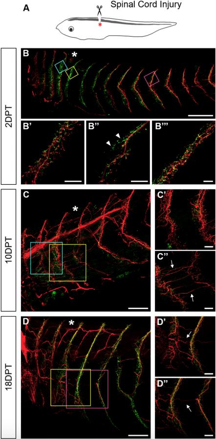 (A) Scheme of the SCI procedure in NF50 X. laevis embryos, where the skin, superficial muscles and the spinal cord were injured (total transection, red asterisk). Injured larvae were collected 2 (A), 10 (B) and 18 (C) days post transection (DPT), immunostained to reveal neurons (using 3A10 plus SV2 antibodies, red) along with staining of AChR aggregates with BTX (green), and imaged by confocal microscopy. Asterisks in B, C and D label the transection site. In B (2DPT embryos), magnified images of the regions labelled with cyan (rostral to the SCI site), yellow (immediately caudal from the SCI site), and purple (more caudal to the SCI site) squares are shown in B', B'', and B''', respectively. Arrowheads in B'' show denervated AChR aggregates. In C (10DPT), magnified images of the regions labelled with cyan (rostral to the SCI site) and yellow (immediately caudal from the SCI site) squares are shown in C' and C'', respectively. In C (18DPT), magnified images of the regions labelled with yellow (immediately caudal from the SCI site) and purple (more caudal from the SCI site) squares are shown in D' and D", respectively. Arrows in C'', D' and D" indicate axonal branching. Orientation of embryos: anterior (left), posterior (right), dorsal (up), ventral (down). Scale bars: 500â¯Î¼m (A); 200â¯Î¼m (BâC); 30â¯Î¼m (A'''); 50â¯Î¼m (B',B'',C',C''); 10â¯Î¼m (A',A").