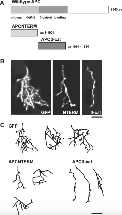 Fig. 1. APC N-terminal and central domains alter branching in optic axonal arbors in vivo. We constructed truncated mutants consisting of the N-terminal and central domains of Xenopus laevis APC (A). The APCNTERM mutant consisted of the N-terminal region of APC (amino acids 1-1034) containing the oligomerization domain and armadillo repeats of APC (A). The APCβ-cat mutant contained the middle third of APC (amino acids 1034-1984) containing the β-catenin binding site of full length APC (A). Example images (B) and reconstructions (C) of optic axonal arbors expressing GFP (controls) or GFP together with an APC mutant (experimentals) in tectal midbrains of intact, living tadpoles (stages 46/47) show alterations in optic axon branching induced by expression of the APC domains. The left most tracing of each group of arbors (C) is based on the arbor image shown in (B). Scale Bar â 30â¯Î¼m (B); 40â¯Î¼m (C).