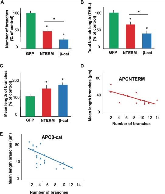 Fig. 2. Quantification of effects of APC domains on optic axonal arbors in vivo. Plots of number of branches (A), total arbor branch length (B), and mean branch length (C) confirm observed differences between optic axonal arbors expressing GFP or GFP together with an APC mutant. Data in A-C is shown as percent of control mean with SEM. * above data bar indicates p < 0.05 for control versus APC mutant. * above horizontal line indicates p < 0.05 for APCNTERM versus APCß-cat condition. Additional scatter plots of number of branches versus mean branch length with regression lines show inverse correlation between these parameters in optic axonal arbors expressing APC domains (D, E). Sample numbers: A) GFP-12, APCNTERM–18 APCβ-cat-25; B) GFP-12, APCNTERM-16, APCβ-cat-25; C) GFP-11, APCNTERM-16, APCβ-cat-25.