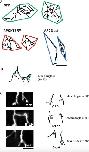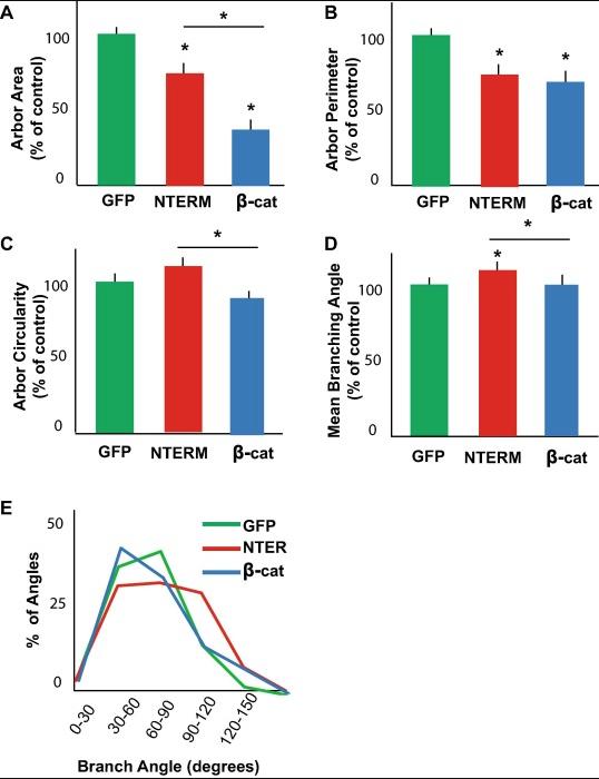 Fig. 4. Quantification of morphology and bifurcation angle of optic axonal arbors in vivo. Quantification of size (A, B) and shape (C) of convex hull polygons confirm additional differences between morphologies of control and APC mutant expressing optic axonal arbors in vivo. Plot and histogram of measurements of mean branch angle in control and APC mutant expressing optic axonal arbors also show alterations in bifurcation angles (D, E). Data in A–D are presented as percent of control mean with SEM. * above data bar indicates p < 0.05 in comparison between control and APC mutant arbors. * above horizontal line indicates p < 0.05 in comparison between APCNTERM and APCß-cat arbors. Sample Numbers: A–C) GFP-13 arbors, APCNTERM-17 arbors, APCβ-cat-29 arbors; D, E) GFP - 92 angles in 10 arbors, APCNTERM - 93 angles in 16 arbors, APCβcat – 104 angles in 18 arbors.