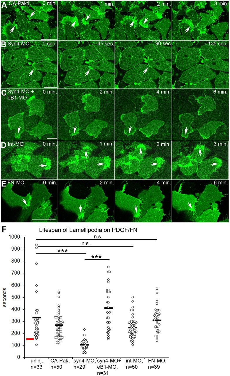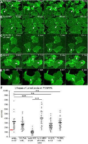 PDGF signaling replaces the csFN function to control protrusion stability. (A-E) Frames from time-lapse recordings of membrane-GFP-labeled LEM cell aggregates on PDGF-FN substratum. (A) Aggregates expressing CA-Pak1. White arrows indicate lamellipodia in all panels. (B) Syndecan 4-knockdown, small, short-lived lamellipodium. (C) Syndecan 4 and eB1-knockdown lamellipodia. (D) Integrin β1-knockdown lamellipodia. (E) Fibronectin-knockdown lamellipodia. (F) Lifespan of lamellipodia on PDGF-FN. Black bars indicate mean values, red bar indicates mean value of aggregates on FN. Statistical significance: ***P<0.0001, n.s., not significant. Scale bars: 30â