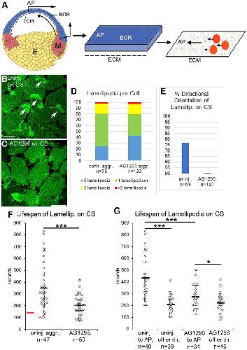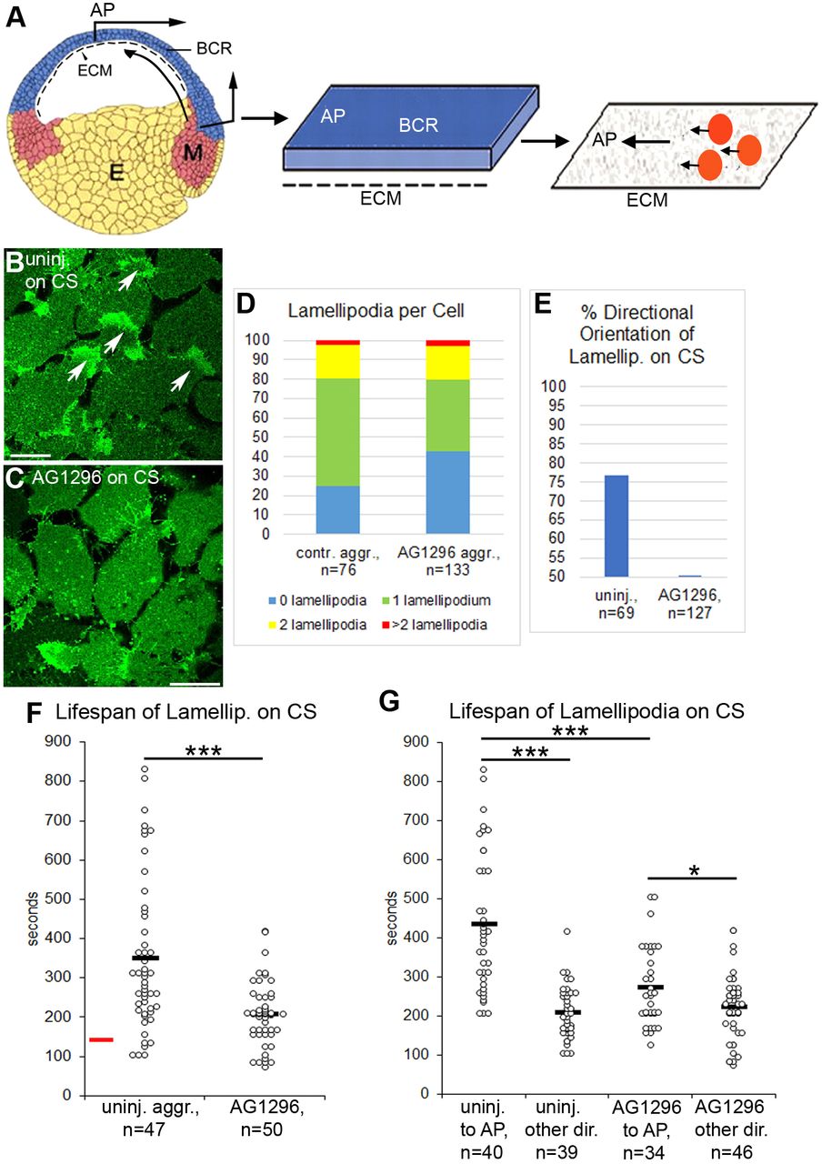 PDGF-A signaling controls protrusive activity on the endogenous FN matrix substratum. (A) Schematic of substratum conditioning. BCR is placed on the glass bottom of the dish to transfer its ECM. LEM explants (orange) migrate directionally towards the animal pole position (AP). E, endoderm; M, mesoderm. Curved arrow, movement of LEM in embryo. (B,C) Membrane-GFP-labeled LEM aggregates on conditioned substratum without (B) or with PDGFR inhibitor AG1296 (C). Arrows indicate lamelliform protrusions oriented towards animal pole (top right). (D-F) Lamellipodia per cell (D), fraction of lamellipodia orientated towards animal pole (E), and lifespan of lamellipodia (F) on conditioned substratum in untreated or AG1296-treated aggregates. Red bar in F indicates average lifespan on FN. (G) Lifespan of lamellipodia pointing animally (to AP; above line perpendicular to animal-vegetal axis) or in other directions (other dir.; along or below this line) in untreated or AG1296-treated LEM aggregates on conditioned substratum. Statistical significance: *P<0.05, ***P<0.0001.