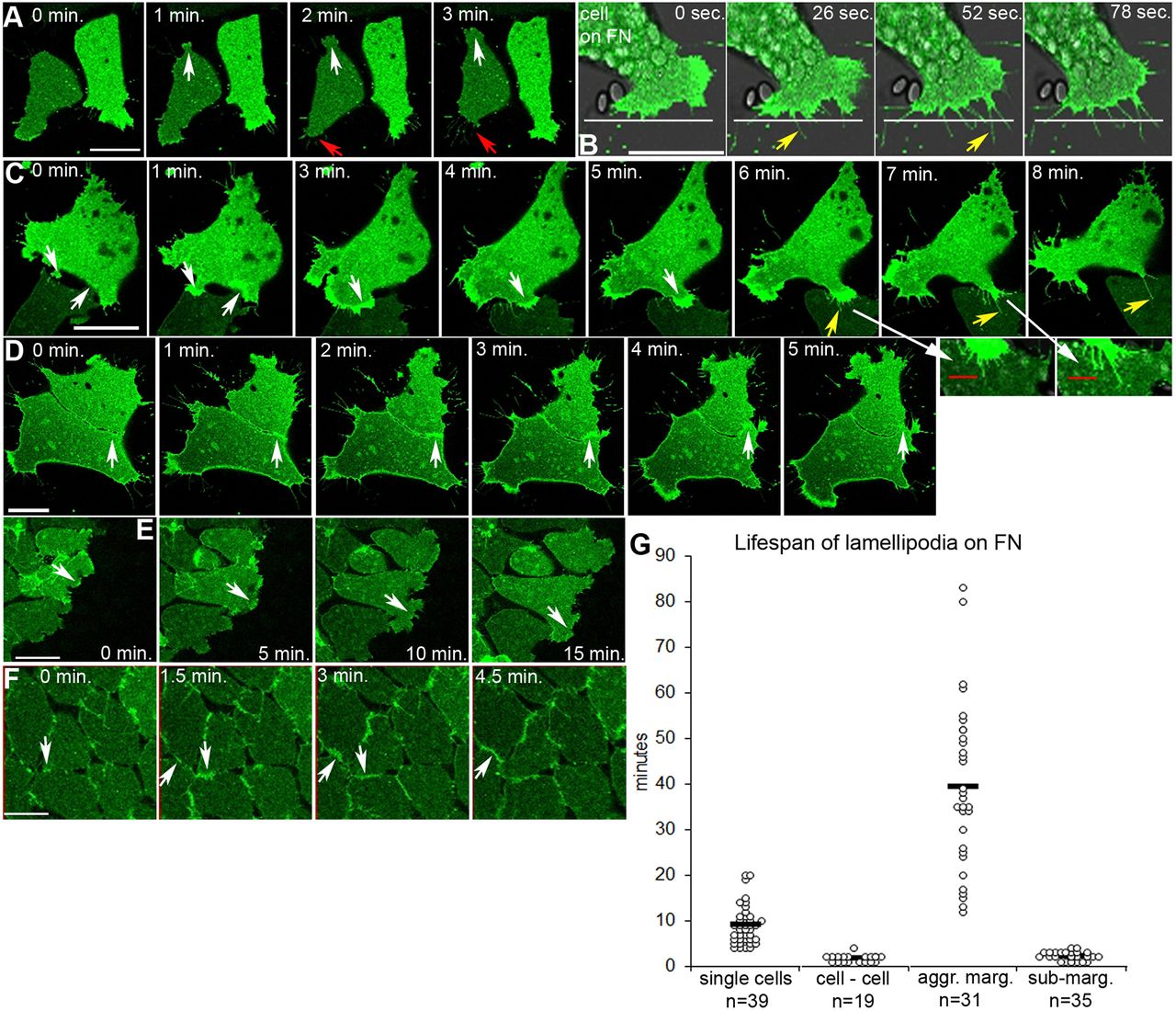 LEM cell aggregation inhibits lamellipodia formation on FN. (A,B) Isolated LEM cells. White arrows show advancing lamellipodia and red arrows show retracting lamellipodia in all panels. (C) Underlapping of LEM cells. Yellow arrows indicate filopodia emanating from a retracting lamellipodium. Long white arrows point to the magnified view, and red lines show the position of the most advanced filopodium at 7 min. (D) Two LEM cells form small, short-lived lamellipodia at the contact site. (E) LEM aggregate with large lamellipodia at the margin. (F) A LEM aggregate forming a few, small, short-lived protrusions submarginally. All cells are labeled with membrane-GFP. (G) Lifespan of lamellipodia; black bars indicate the mean values. Scale bars: 30 µm.